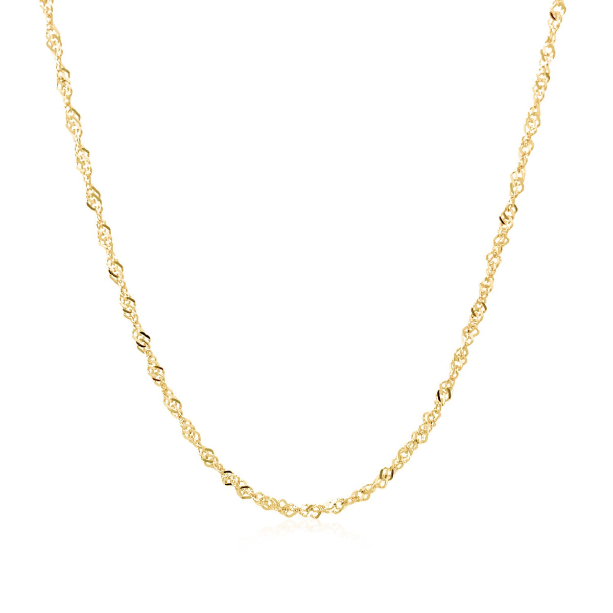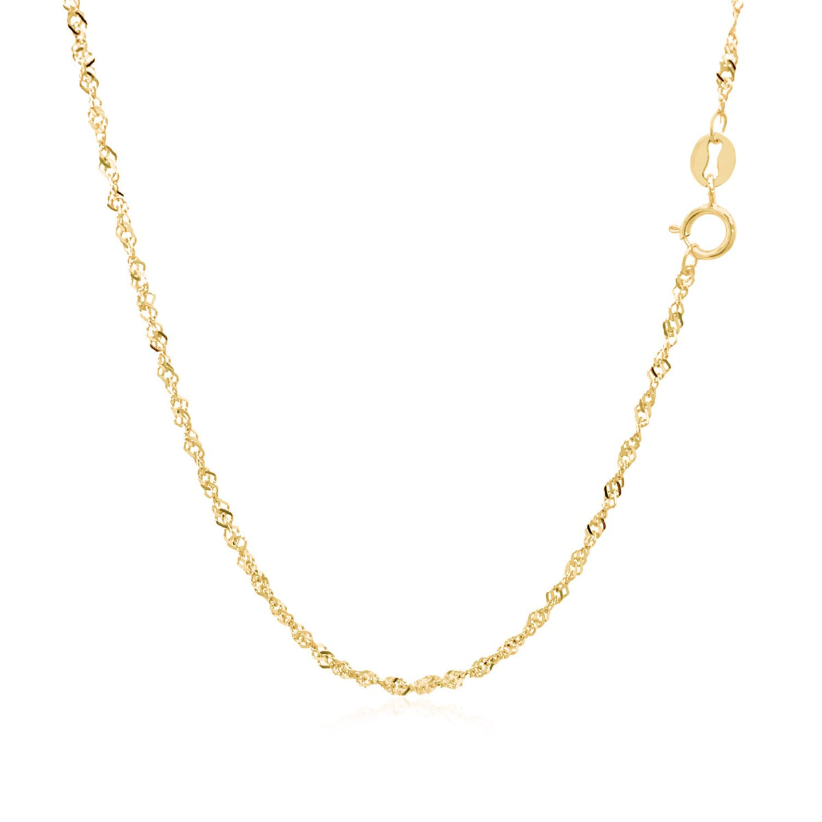 This Singapore chain comes in 14k yellow gold and has a width of 1.30 millimeters.