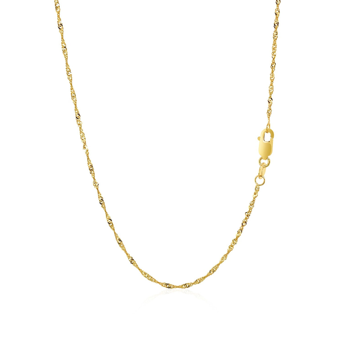 This Singapore chain comes in 14k yellow gold and has a width of 1.30 millimeters.