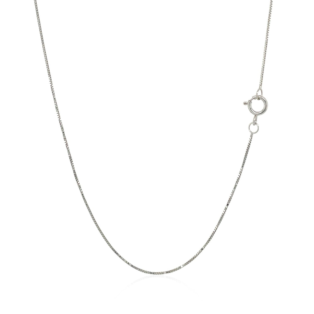 This classic box chain comes in 14k white gold and has a width of 0.45 millimeters.