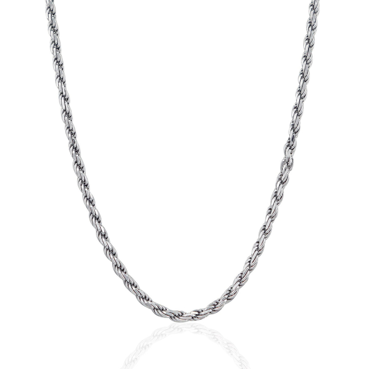 This classic chain crafted in gleaming sterling silver with rhodium polish featuring a diamond cut, rope type design, it had a width of 3.6 millimeters and secured with a lobster clasp.