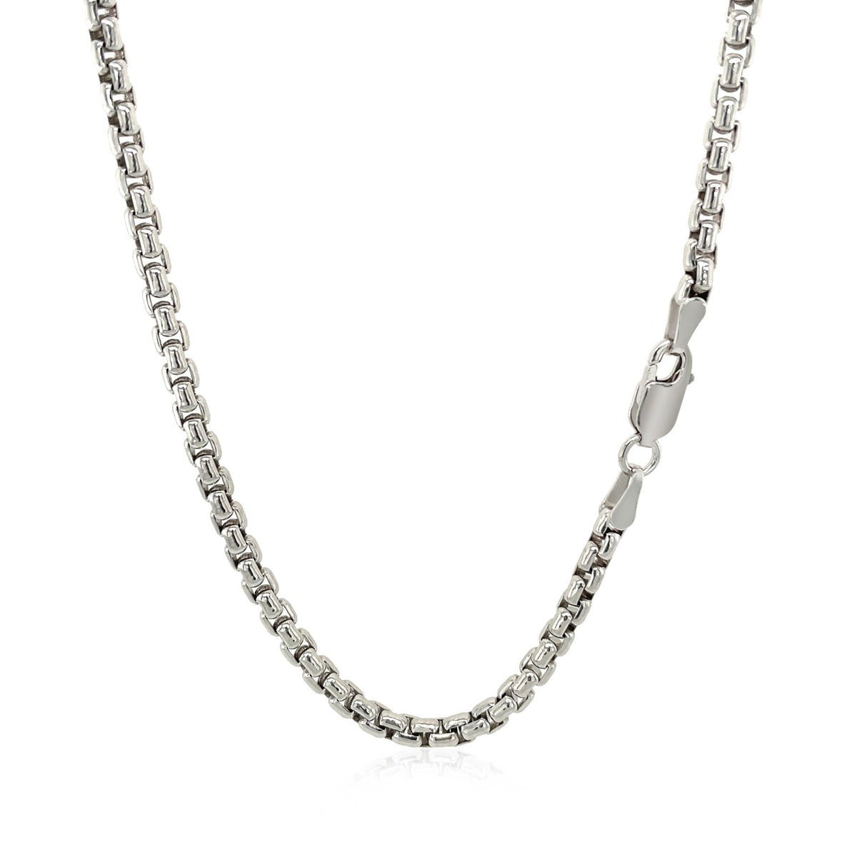 This rhodium-plated round box chain comes in sterling silver and has a width of 3.0 millimeters.