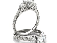 Radiating sophisticated style and elegance, this three stone round diamond ring showcases Baroque inspired filigree detailing along the shank. Quite a marvelous piece made of 14k white gold.