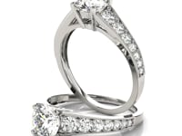 An alluring round prong set diamond ring with an antique-inspired style. Showcasing a tapered shank with bead set single row stones and milgrain detailing, this beauty is made of 14k white gold.
