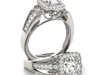 A captivating beauty made of 14k white gold. This round cut diamond engagement ring showcases baroque shank style and a square shaped halo border.
