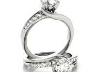 A delightfully designed 14k white gold round diamond ring featuring a bypass style and a band with pave set stones and smooth section detailing.