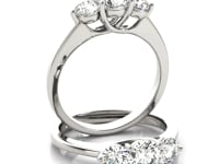A study in a simple style; this round diamond ring features three brilliant stones in a prong setting made of fine 14k white gold.