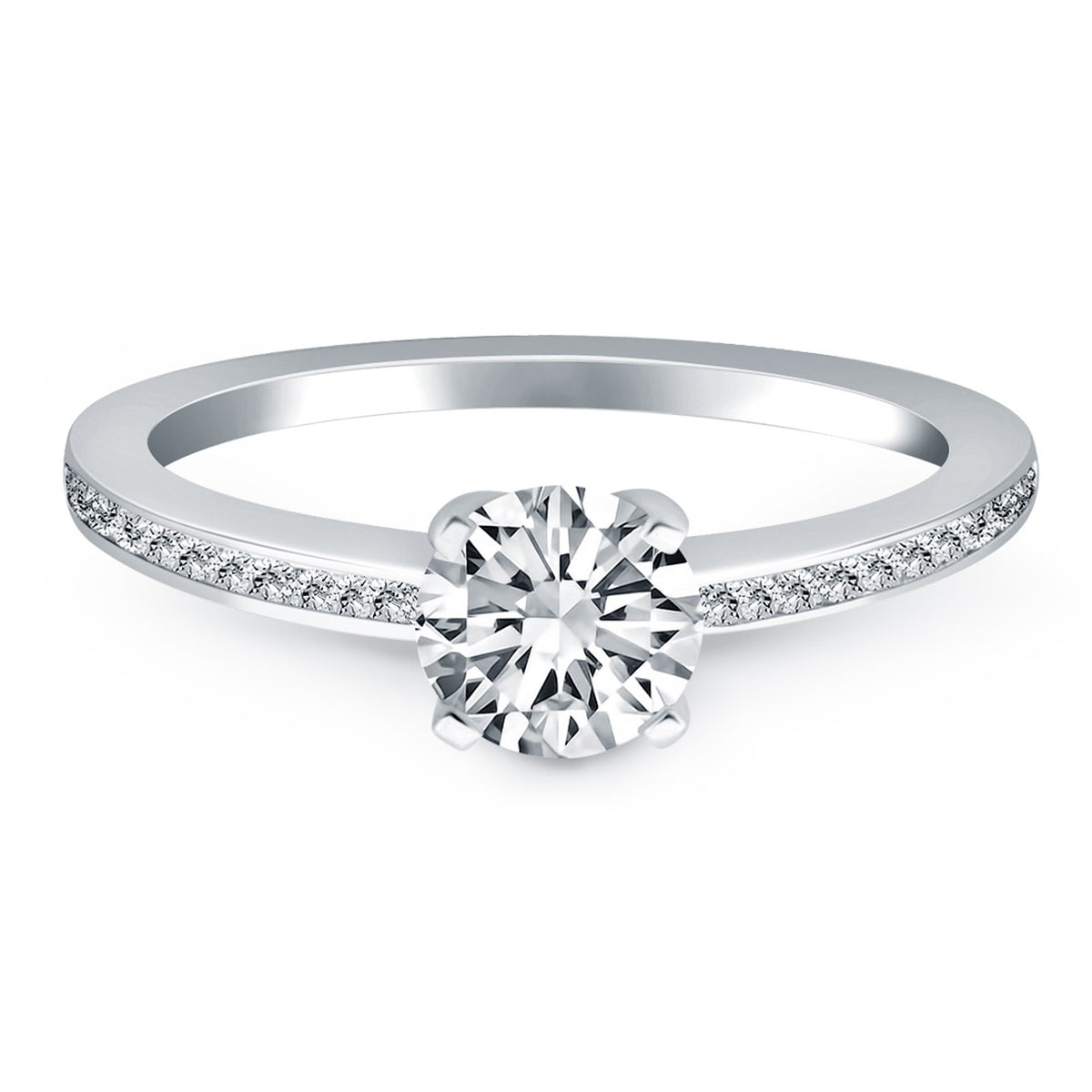 Dazzling pave diamonds enliven the band of this classic engagement ring. Set 3/4 of the way around, this expertly crafted ring gleams in 14k white gold. The center highlights a sparkling 1/2 carat round cut diamond.