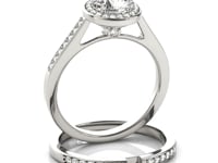 A beautifully crafted 14k polished white gold engagement ring with a round center stone and smaller channel-set diamonds along the halo and band.