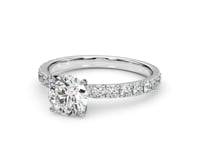 A delightful round prong set diamond ring with an intricately set single row band. Designed in 14k white gold.