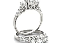 Delightful and gorgeous in 14k white gold, this 3 stone diamond ring features classic trellis prong setting and a shank with accent brilliant stones.