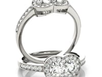Two round center diamonds are beautifully halo set and highlighted by an intricate milgrain design on this gorgeous ring. Made of 14k white tone gold.