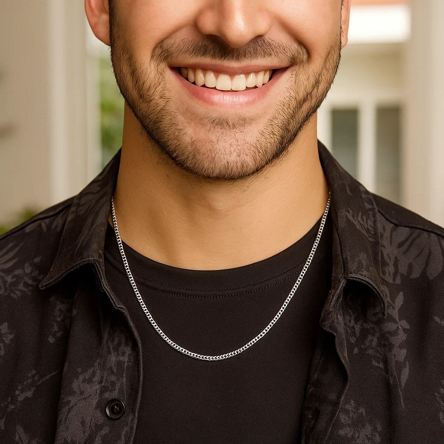 This solid curb chain comes in 14k white gold and has a width of 2.6 millimeters.