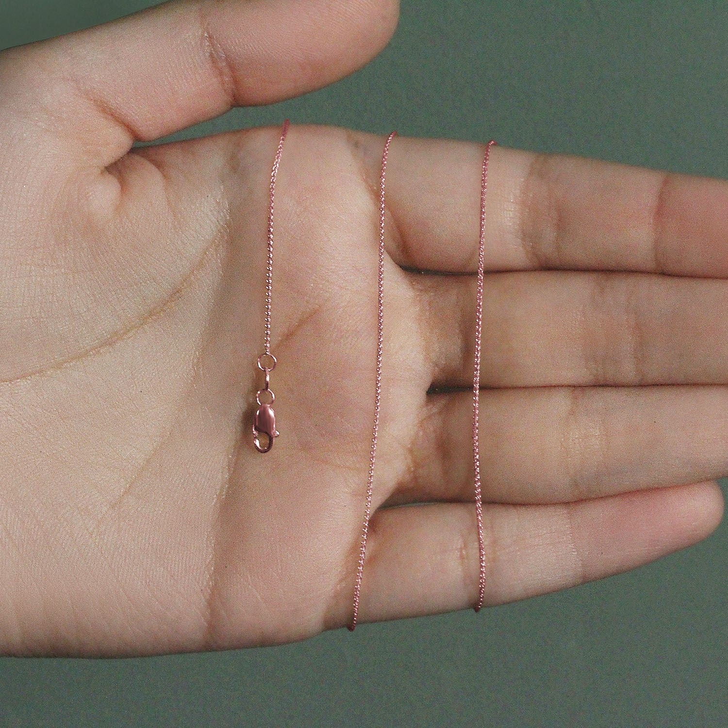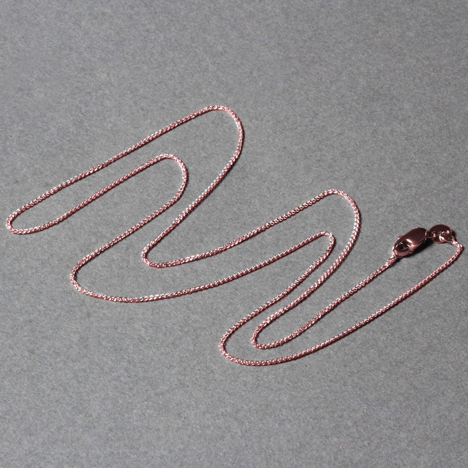 This round wheat chain comes in 14k rose gold and has a width of 0.80 millimeters.