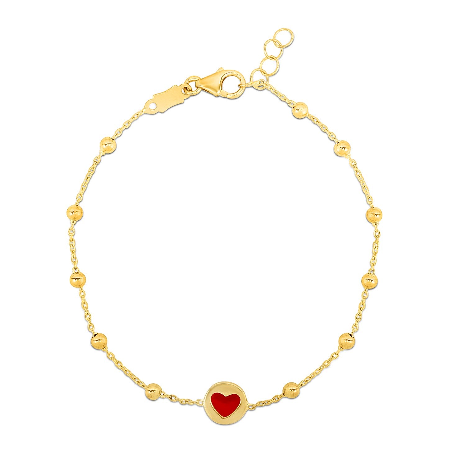 A single red enameled heart and lovely polished beads decorate this beautiful 14k yellow gold Childrens bracelet. Bracelet is 6 inches and closes with a lobster clasp.
