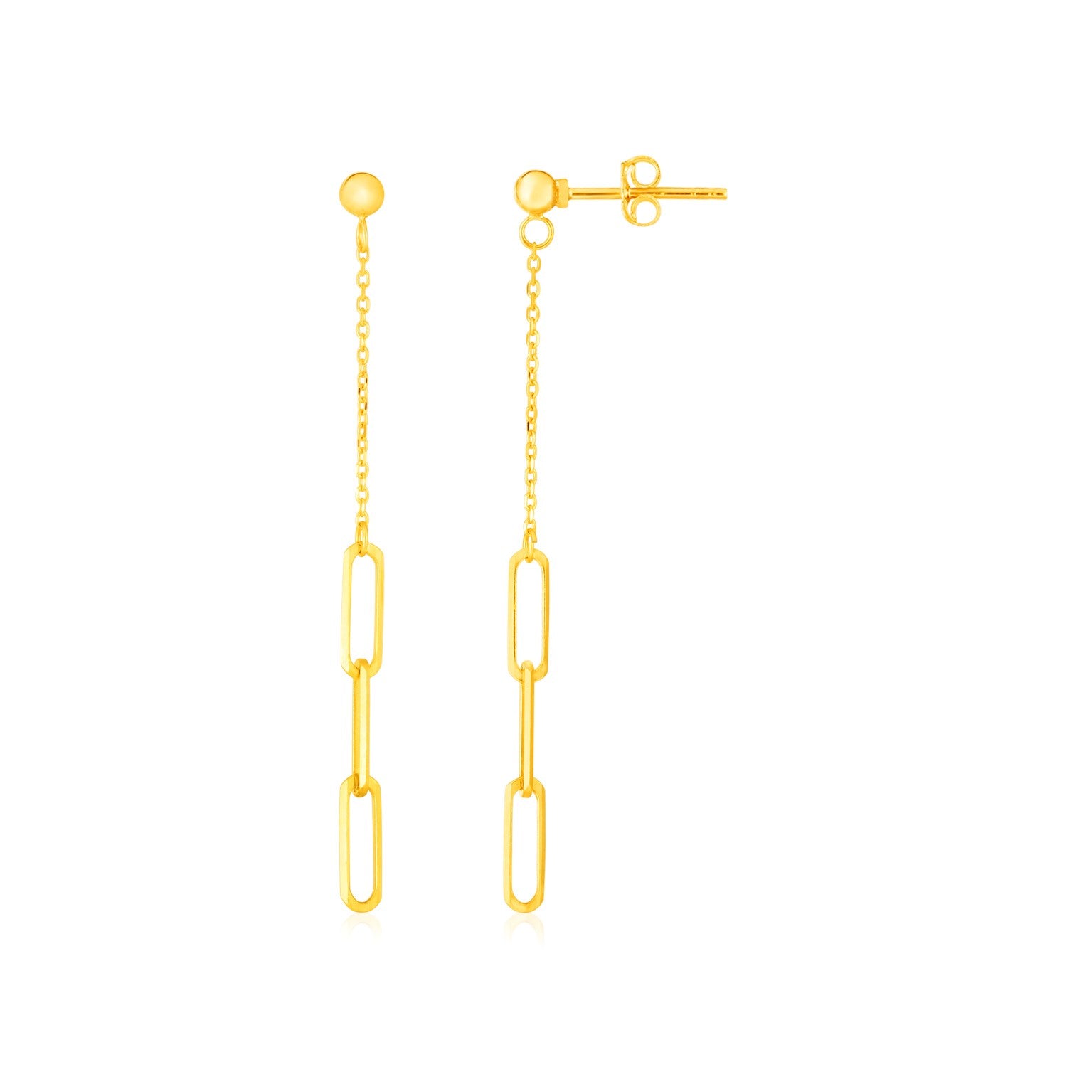 Delicate chain suspends flashing links of paperclip chain in these radiant 14K yellow gold earrings. Post earrings measure 51.7x2.9mm and are held in place by pushback clasps.