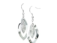 Center marquis elements with a weave like texture highlight the open smooth outer marquis sections of these gorgeous dangling earrings. Made of rhodium plated sterling silver and secured with french wires.