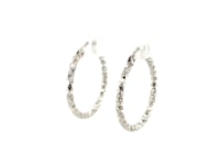 Woven inspired motif renders these lovely hoop earrings delightfully sparkly. Designed in rhodium plated sterling silver, these pieces come with snap locks.